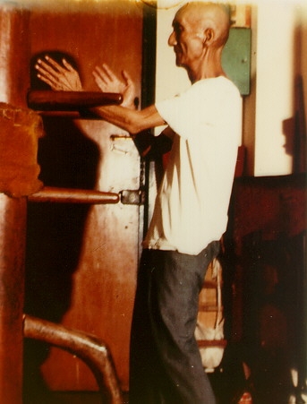 Yip Man is famous for popularizing Wing Chun beyond China into Hong Kong and The West. Here he is practicing on the Mook Yan Jong or wooden dummy.